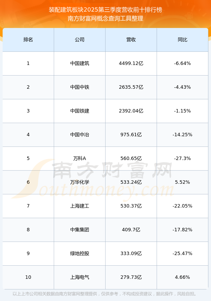 按照南方財富網(wǎng)概念查詢工具統(tǒng)計,該股所屬板塊為裝配建筑板塊,該板塊共有92只股票,中國建筑2025第三季度營收在該板塊中排名為第1名,該板塊2025第三季度營收排名前十的股票如下表: