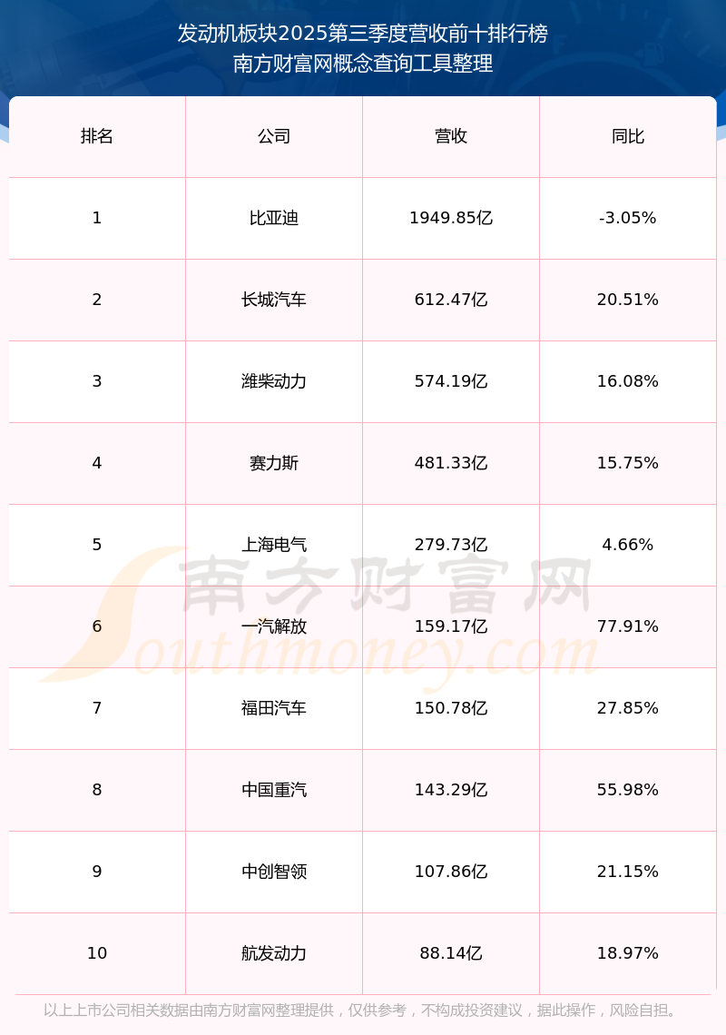 按照南方財(cái)富網(wǎng)概念查詢工具統(tǒng)計(jì),該股所屬板塊為發(fā)動機(jī)板塊,該板塊共有118只股票,東安動力2025第三季度營收在該板塊中排名為第40名,該板塊2025第三季度營收排名前十的股票如下表: