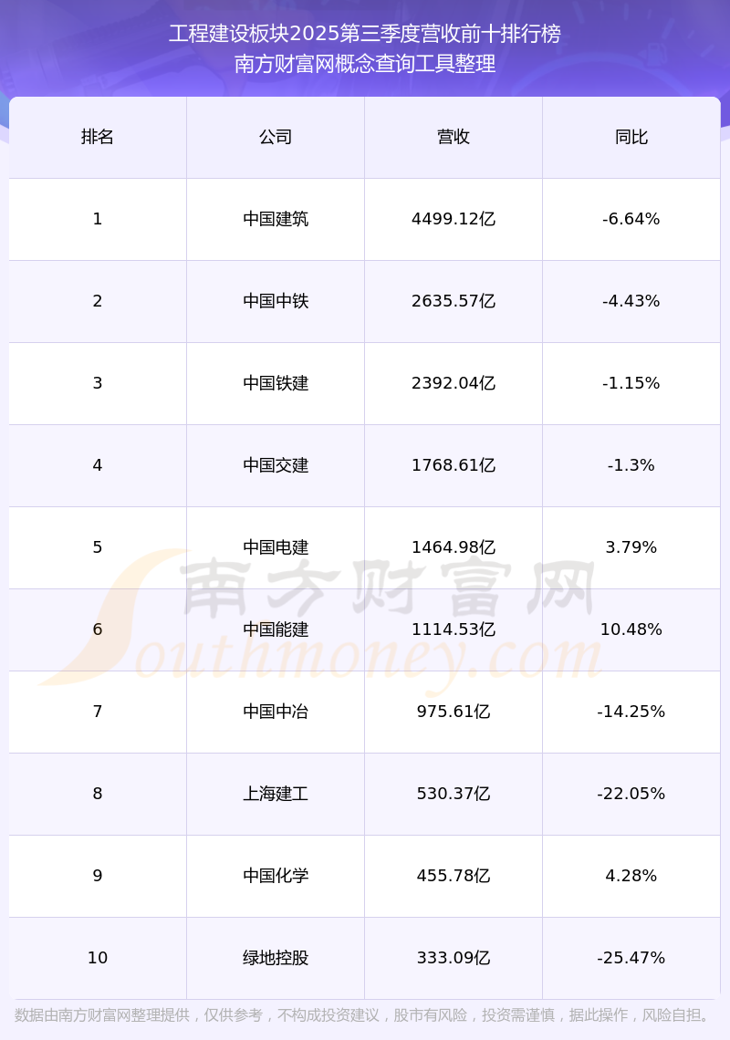 按照南方財(cái)富網(wǎng)概念查詢(xún)工具統(tǒng)計(jì),該股所屬板塊為工程建設(shè)板塊,該板塊共有139只股票,東湖高新2025第三季度營(yíng)收在該板塊中排名為第79名,該板塊2025第三季度營(yíng)收排名前十的股票如下表: