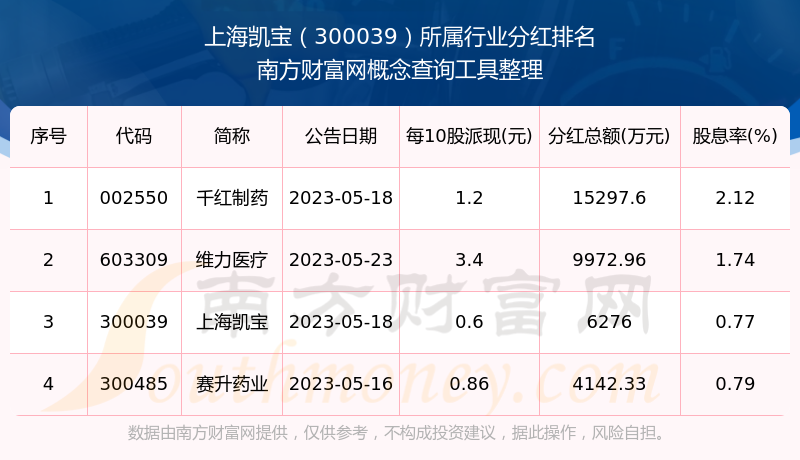 按照南方財富網趨勢選股系統(tǒng)統(tǒng)計,上海凱寶所屬行業(yè)為針劑行業(yè),針劑行業(yè)分紅排名情況如下表: