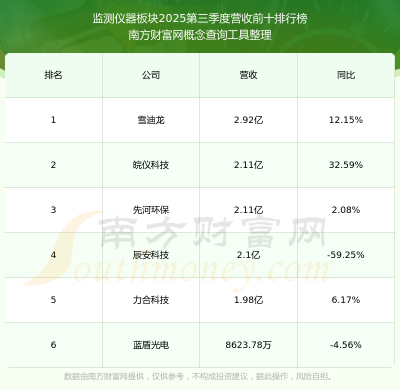 按照南方財(cái)富網(wǎng)概念查詢工具統(tǒng)計(jì),該股所屬板塊為監(jiān)測(cè)儀器板塊,該板塊共有6只股票,禾信儀器2025第三季度營(yíng)收在該板塊中排名為第6名,該板塊2025第三季度營(yíng)收排名前十的股票如下表: