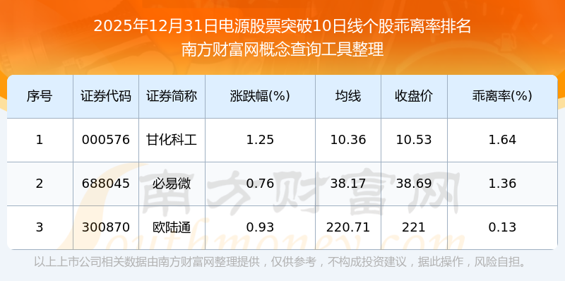 根據(jù)南方財富網(wǎng)概念查詢工具數(shù)據(jù)統(tǒng)計,截止2025年12月31日收盤,電源股票共有3只個股收盤價向上突破了10日線。其中乖離率較大的個股有甘化科工、必易微、歐陸通等,乖離率分別為1.64%、1.36%、0.13%。