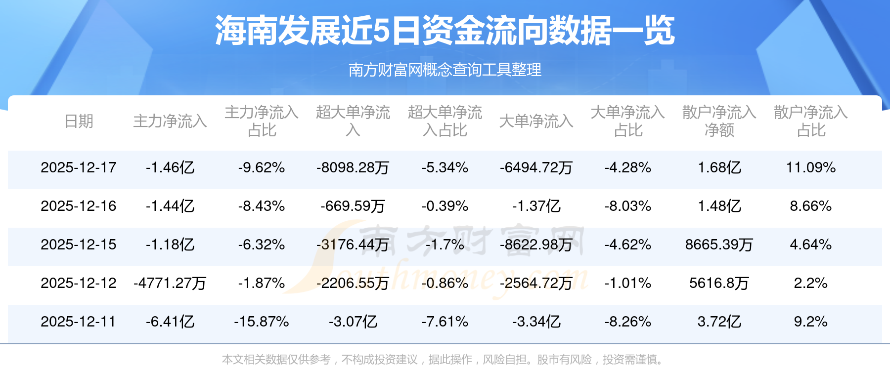 12月17日消息,海南發(fā)展12月17日主力凈流出1.46億元,超大單凈流出8098.28萬(wàn)元,大單凈流出6494.72萬(wàn)元,散戶(hù)凈流入1.68億元。