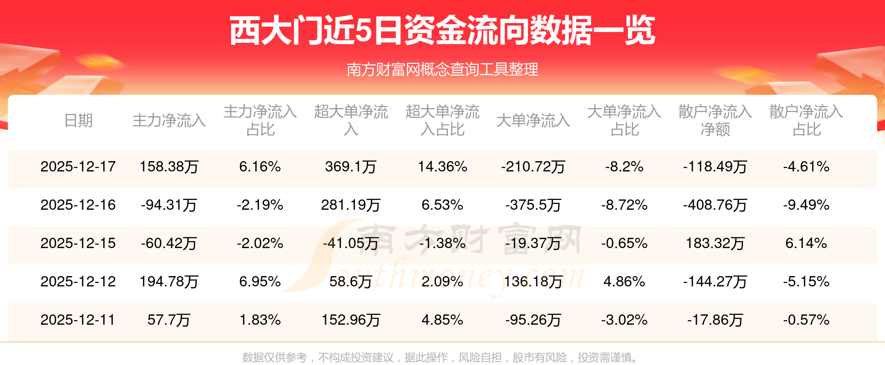 12月17日該股主力凈流入158.38萬元,超大單凈流入369.1萬元,大單凈流出210.72萬元,中單凈流出39.89萬元,散戶凈流出118.49萬元。