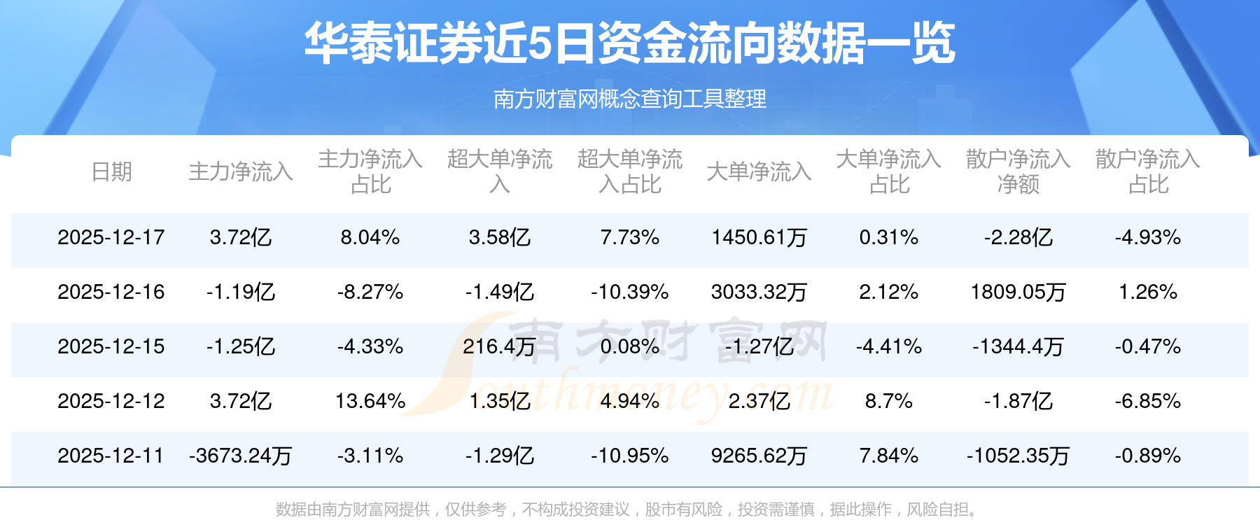 12月17日消息,華泰證券主力凈流入3.72億元,超大單凈流入3.58億元,散戶凈流出2.28億元。