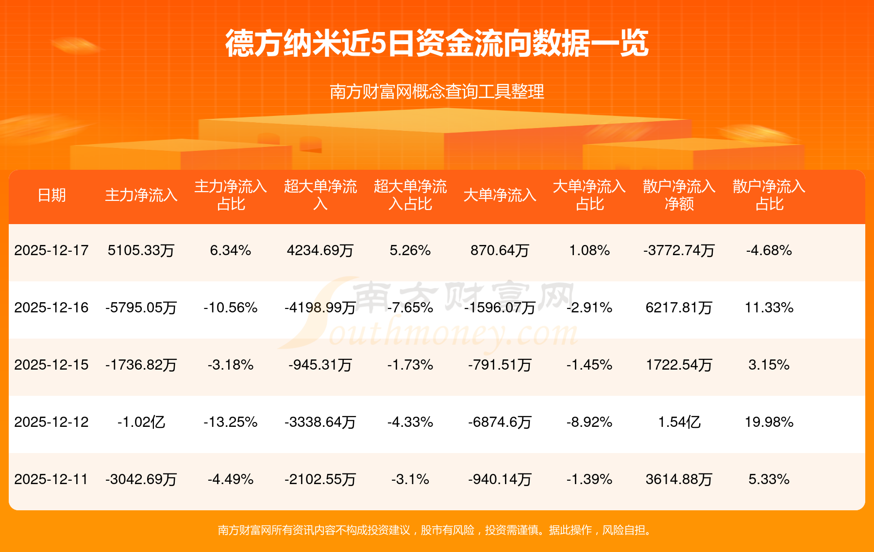 12月17日消息,德方納米主力凈流入5105.33萬(wàn)元,超大單凈流入4234.69萬(wàn)元,散戶凈流出3772.74萬(wàn)元。