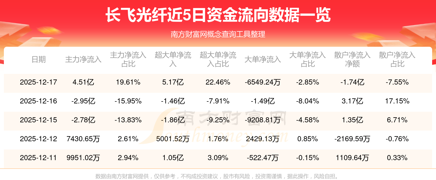 12月17日消息,長(zhǎng)飛光纖主力資金凈流入4.51億元,超大單資金凈流入5.17億元,散戶(hù)資金凈流出1.74億元。