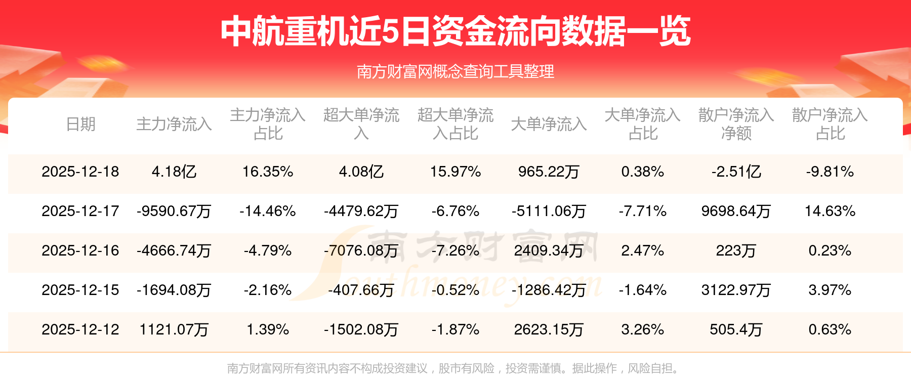 12月18日消息,中航重機(jī)資金凈流入4.18億元,超大單凈流入4.08億元,換手率9.21%,成交金額25.56億元。