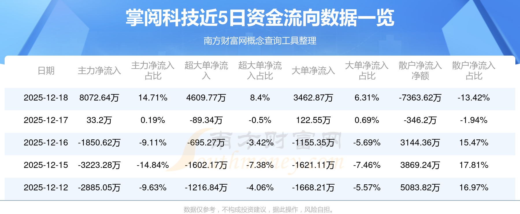 12月18日消息,掌閱科技12月18日主力凈流入8072.64萬元,超大單凈流入4609.77萬元,大單凈流入3462.87萬元,散戶凈流出7363.62萬元。