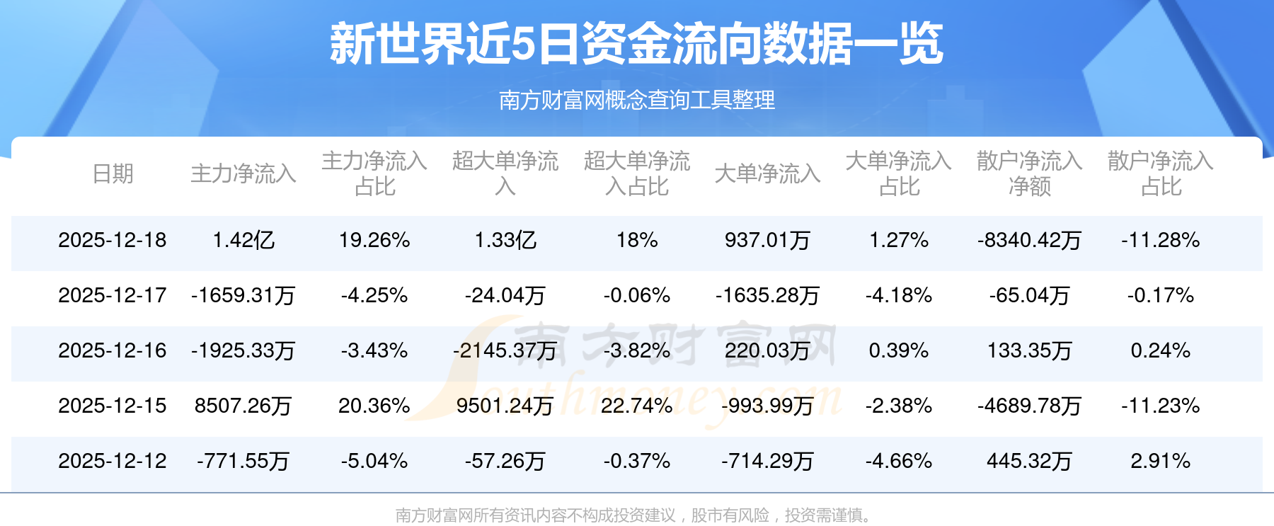 12月18日消息,新世界12月18日主力資金凈流入1.42億元,超大單資金凈流入1.33億元,大單資金凈流入937.01萬元,散戶資金凈流出8340.42萬元。