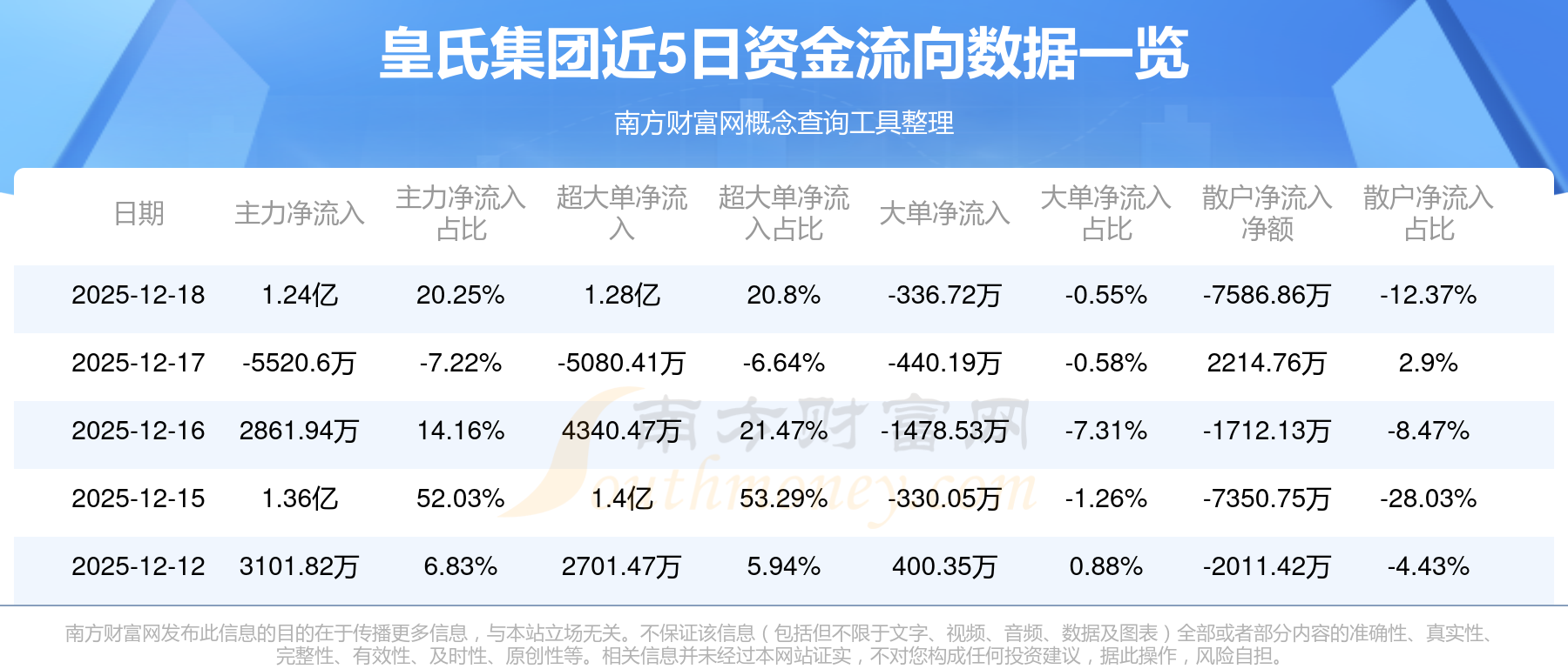 12月18日消息,皇氏集團(tuán)12月18日主力資金凈流入1.24億元,超大單資金凈流入1.28億元,大單資金凈流出336.72萬(wàn)元,散戶(hù)資金凈流出7586.86萬(wàn)元。