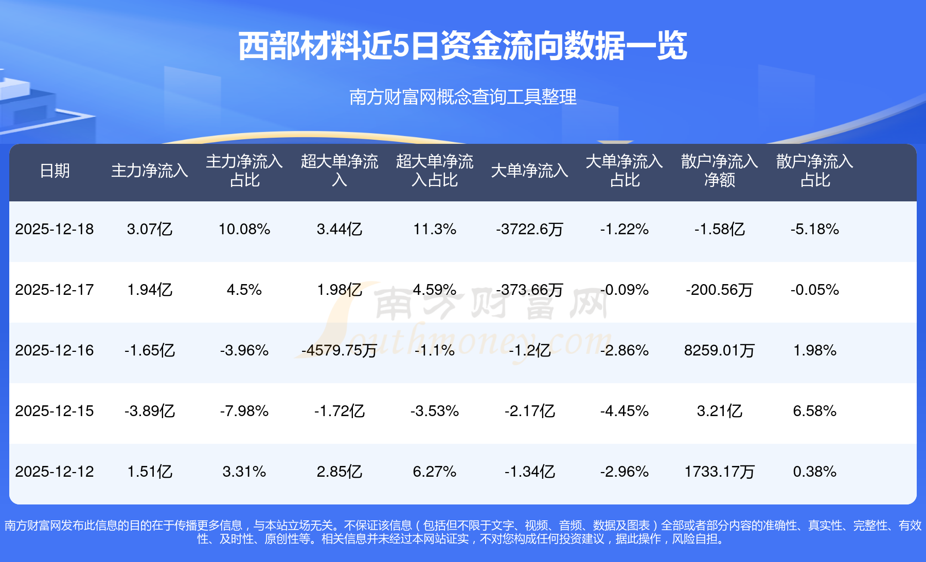 12月18日消息,西部材料12月18日主力資金凈流入3.07億元,超大單資金凈流入3.44億元,大單資金凈流出3722.6萬(wàn)元,散戶資金凈流出1.58億元。