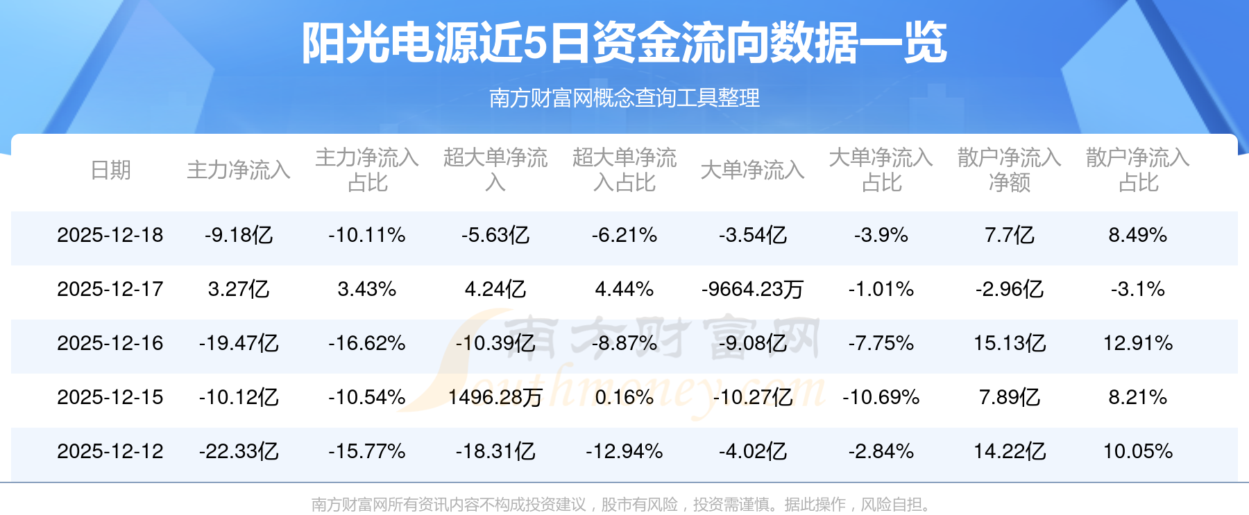 12月18日消息,陽光電源資金凈流出9.18億元,超大單凈流出5.63億元,換手率3.5%,成交金額90.74億元。