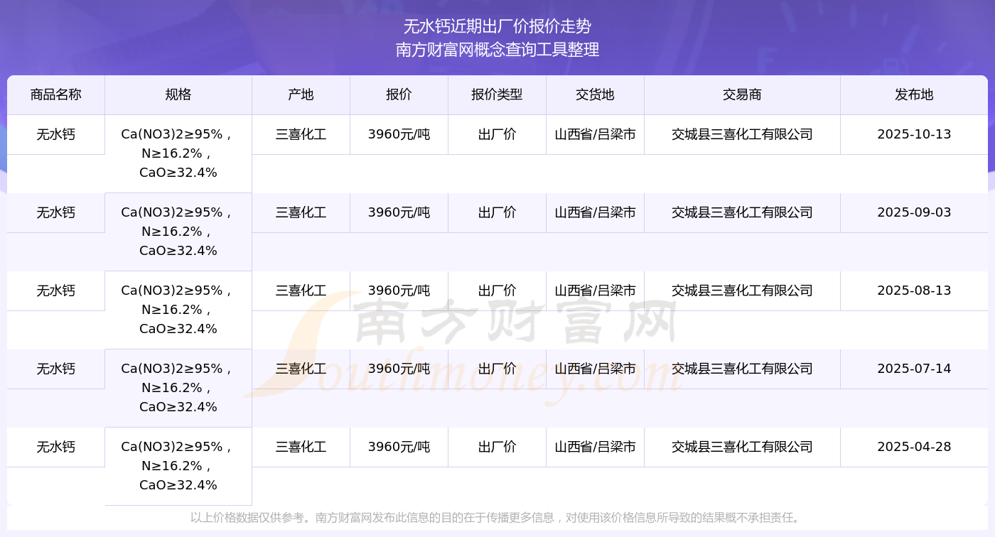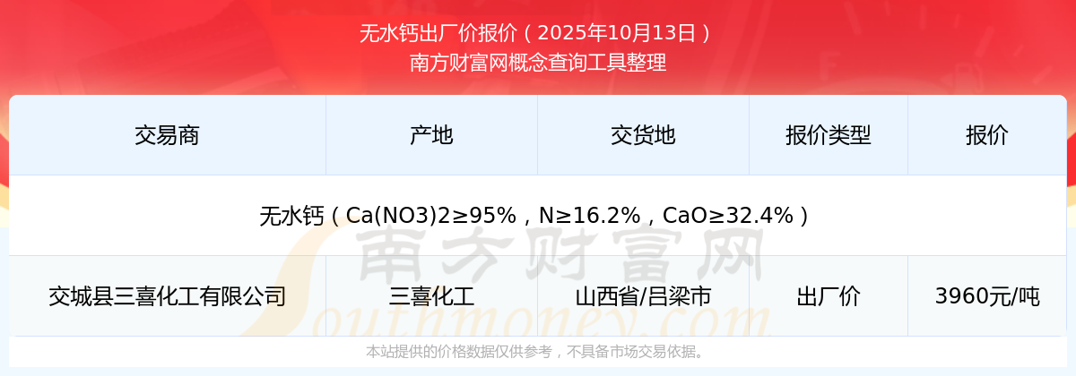 2025年10月13日,無水鈣(Ca(NO3)2≥95%,N≥16.2%,CaO≥32.4%)出廠價價格為3960.00元/噸,報價人:交城縣三喜化工有限公司,交易地點(diǎn)為山西省/呂梁市。