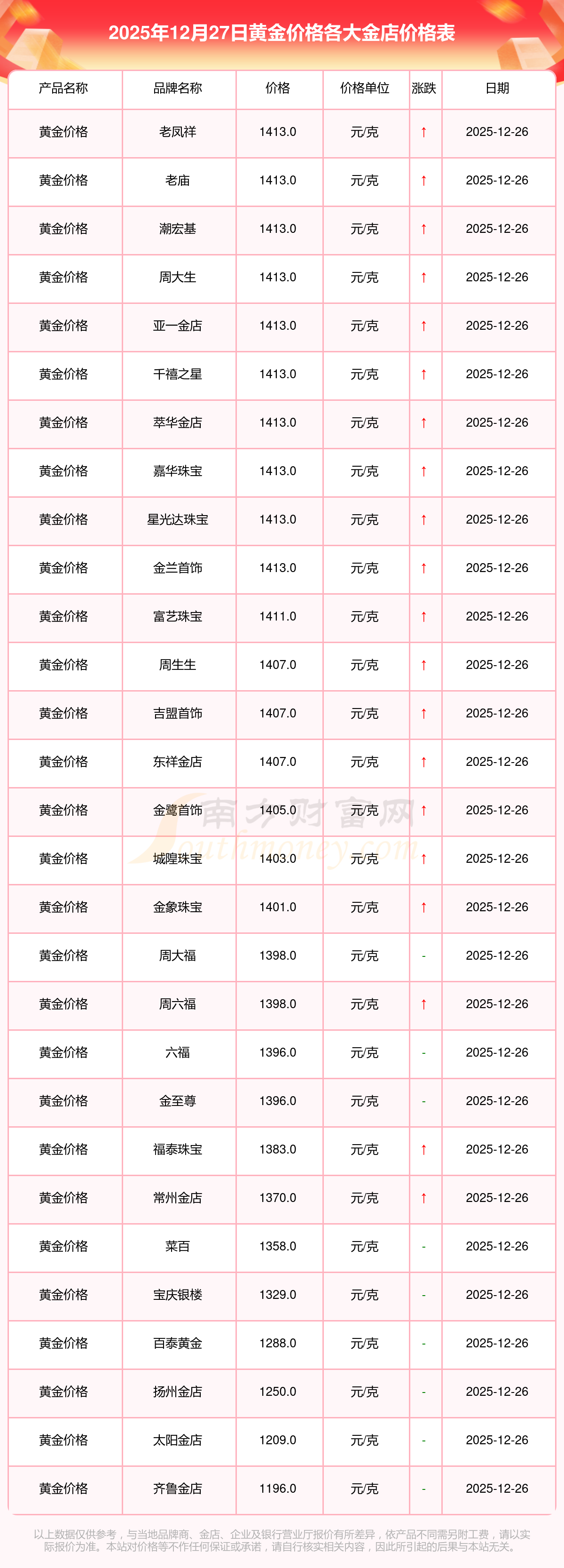 2025年12月27日各大金店黃金價(jià)格多少一克?各大金店黃金價(jià)格報(bào)價(jià)表詳情,每家金店的黃金價(jià)格之所以不一樣,黃金基礎(chǔ)價(jià)格是由國(guó)際黃金市場(chǎng)的供求關(guān)系和價(jià)格波動(dòng)所定的。金店會(huì)根據(jù)國(guó)際金價(jià)的變化來(lái)制定和調(diào)整金飾的價(jià)格。接下來(lái)隨小編來(lái)看看今日市場(chǎng)行情。
