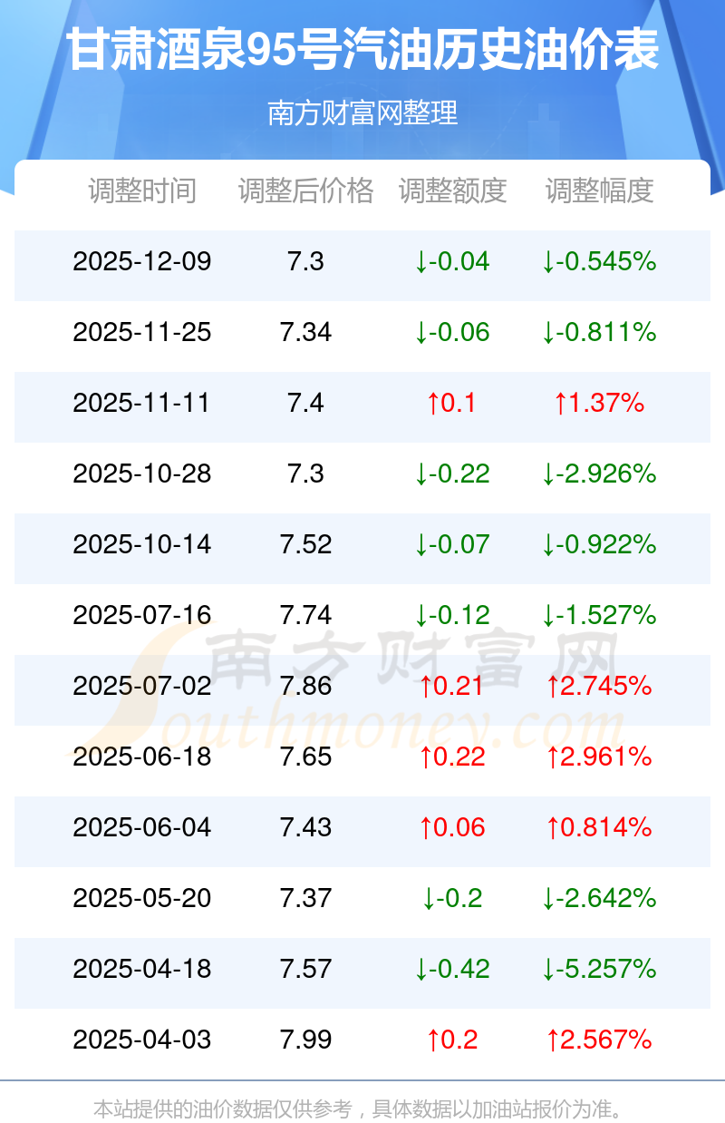 2025年95號(hào)汽油價(jià)格調(diào)整一覽表